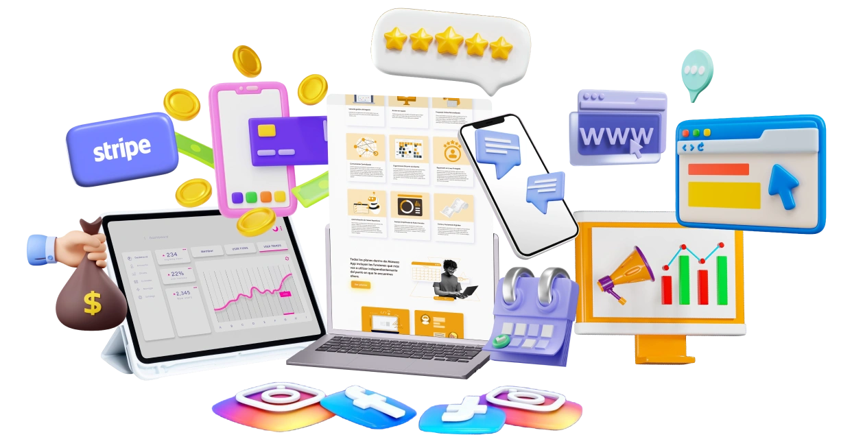 No vas a tener que integrar herramientas para mejorar tu flujo de trabajo, desde aquí podrás tener tu sitio web, Funnels de ventas, ecommerce, campañas de email, sms, gestión de reputación… todo en un solo lugar y con unos pocos clics impulsarás tu negocio.